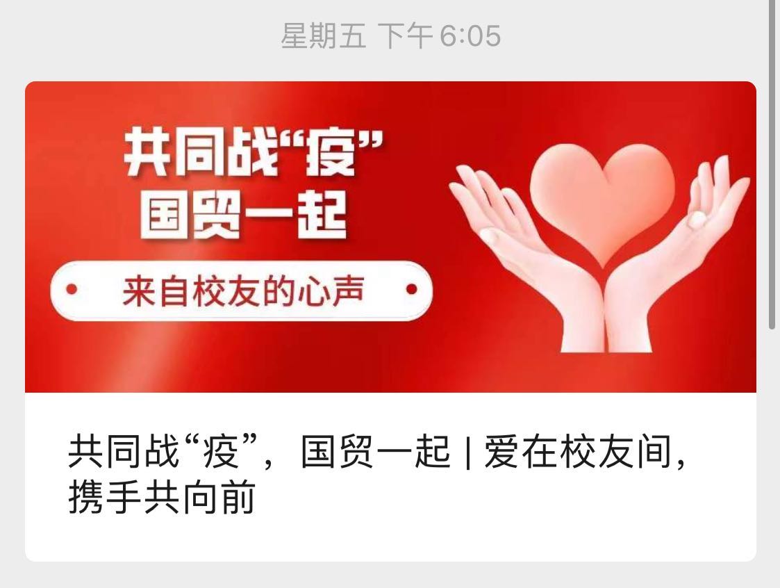 在这场抗疫战中,身处世界各地的国贸员工们坚定地与母校一起,共克时艰,守土尽责,以实际行动投身到捐款捐物的行动中去、投身到稳定金融市场的工作中去、投身到支持中小微企业发展的工作中去、投身到支援抗疫第一线的滚滚浪潮中去,为打赢疫情防控战做出了国贸人的贡献。对于曾经一起成长、并肩抗击过“非典”的国贸员工而言,共同战“疫”的过程更是有特别的意义,2001级员工储慧在文章中写道,“往事并不如烟,那一年我们携手抗击‘非典’。我将保持和发扬抗击非典时的优良传统,为打赢疫情防控的人民战争做出应有的贡献。”