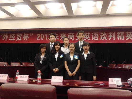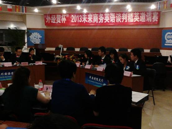 6月7日~6月8日,2013年“外经贸杯”未来商务英语谈判精英邀请赛于对外经济贸易大学诚信楼举行。此次比赛由中国管理现代化研究会国际商务谈判专业委员会主办,对外经济贸易大学英语公司承办,比赛采用全英文商务谈判案例,要求参赛队伍通过英文模拟实战谈判,对参赛队伍的整体素质具有较高的要求,是目前国内高校间较高层次的谈判赛事活动。同时赛事组委会邀请官、产、学、研等领域的知名专家和学者组成评审团,对各参赛队伍的比赛成绩进行严格而专业的评审。