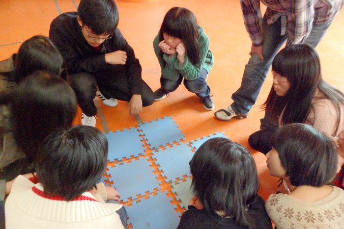 下午1点,素拓活动正式开始。以1—10的扑克牌花色随机分组的同学们,为队伍创造了各式各样的队名和造型。或神棍节的“11.11.11”,或“牵”手观音,或火车或梅花,搭配新鲜而创意的队名与口号,在开怀一笑的同时,充分展现了国贸同学们的创意魅力。在接下来的三个活动环节中,各小队大显身手,破解一个个游戏难题。“步步惊心”中,他们齐心协力,奋勇前进,击掌庆祝;“盲人排队”中,他们开发智慧,带着眼罩的四小队用四种不同方法,尽他们最大可能,以最短的时间以1-9的号码顺序站好。在最为考验团队耐力与协作的“孤岛求生”环节,每队都使出“十八般武艺”,让所有队员都能在越来越少的拼图上寻得“一席之地”。最终,持梅花花色的小组九位成员在30cm*30cm的拼图上坚持了十秒,创造了团队奇迹。