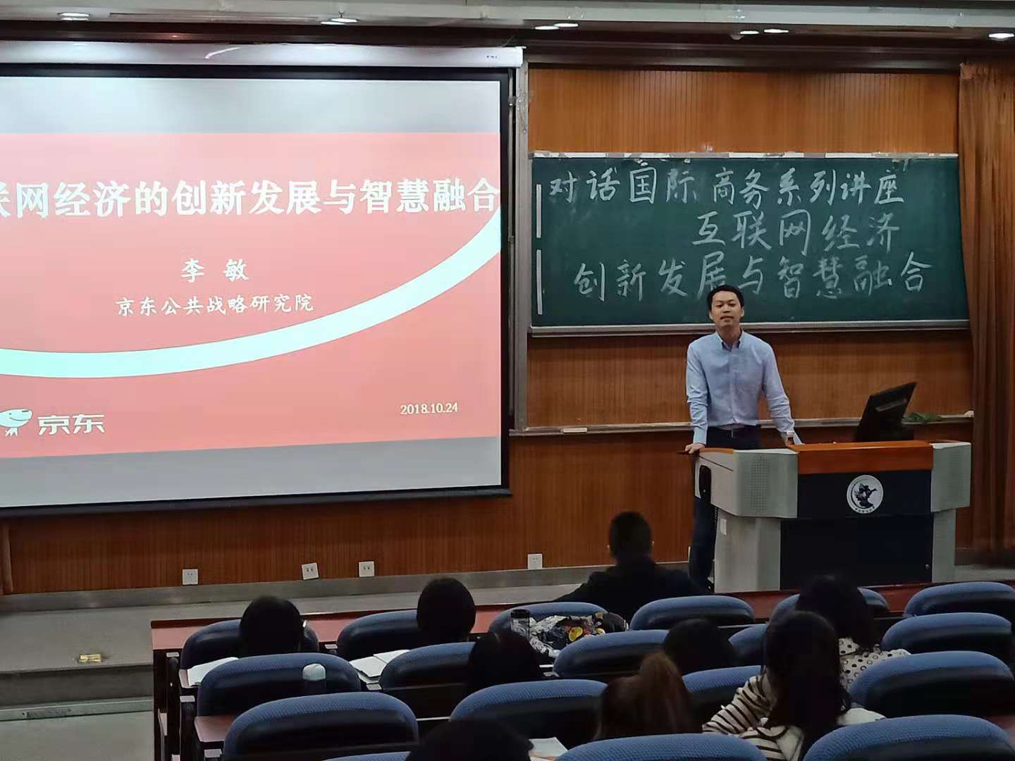 2018年10月24日晚,“对话国际商务”系列讲座第十场在沙河校区东区公司楼3号楼222教室成功举行。本场讲座非常荣幸的邀请到京东公共战略研究院高级研究院李敏博士担任主讲嘉宾。李敏博士的主要研究方向包括互联网经济、企业战略、电子商务等,本次主讲的题目为“互联网经济的创新发展与智慧融合”。讲座由M88官方网站国际商务系主任霍达副教授主持。