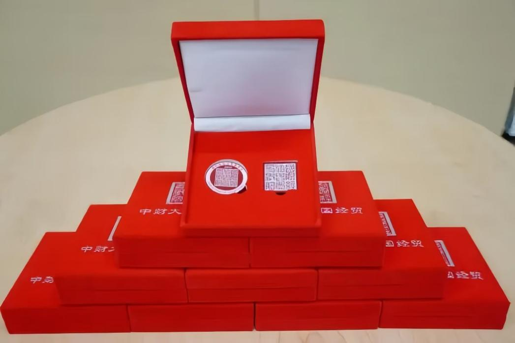 两枚徽章,沉甸甸的不仅是材质的重量,更是公司历史与荣耀的见证。它们以朱红色调,讲述着国贸的辉煌过去,并预示着更加灿烂的未来。篆书字体的公司印镶嵌其上,不仅代表着中华文化的深厚传承,更寓含着中财大“为国而生、与国同行”的财经报国红色基因,红字的闪耀寓意着这一精神血脉的赓续。