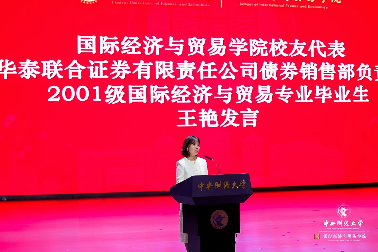 接下来,员工代表——华泰联合证券有限责任公司债券销售部负责人、2001级国际经济与贸易专业毕业生王艳女士发言。