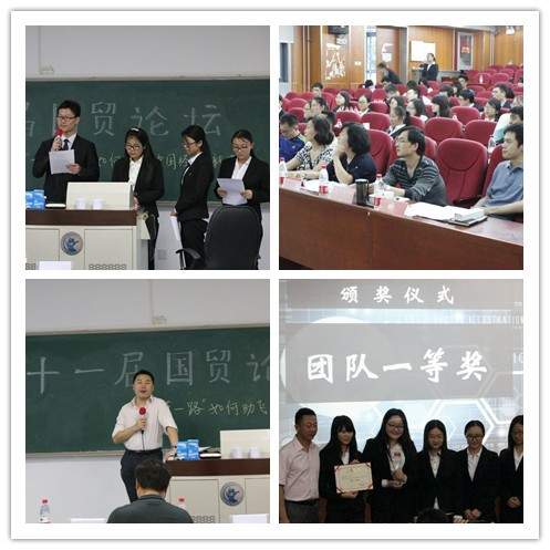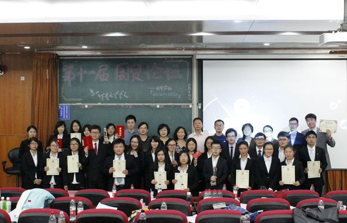 5月13日,国贸论坛决赛在沙河校区公司楼7号楼115举行,出席决赛的评委有国贸公司副经理刘春生老师,国贸公司李军老师、李瑞琴老师、周世民老师、符大海老师、刘悦老师和颜菁老师。参与决赛角逐的队伍包括来自本校的四支晋级队伍和来自对外经济与贸易大学的两支队伍。决赛共分为四个部分:百舸争流、指点江山、评委点评和颁奖仪式。在百舸争流部分,各队分别有三分钟介绍时间、六分钟展示时间和一分钟提问时间。每个队伍在此环节中都各展风采,用独到的方式介绍自己、展示PPT。而提问时间各队成员各抒己见,提出独到深刻的问题,为自己队增光添彩。在指点江山的环节里,各队代表就自己队的视频和问题阐述了自己的看法,或新颖或令人眼前一亮,十分出彩。评委点评中,刘春生老师、李瑞琴老师和周世民老师等都就本次比赛做出点评,指出各队在比赛时的优点和缺点。最终,耶路不太冷队获得了一等奖,国士无双队和丝路使者队分获二、三等奖,HOTs队获得最佳团队奖,对外经济与贸易大学的国贸学社队和Guide队分获最佳创意奖和最佳风采奖,队员曹鹏彧获得个人口才奖。评委和老师分别为获奖队伍颁奖并合影。