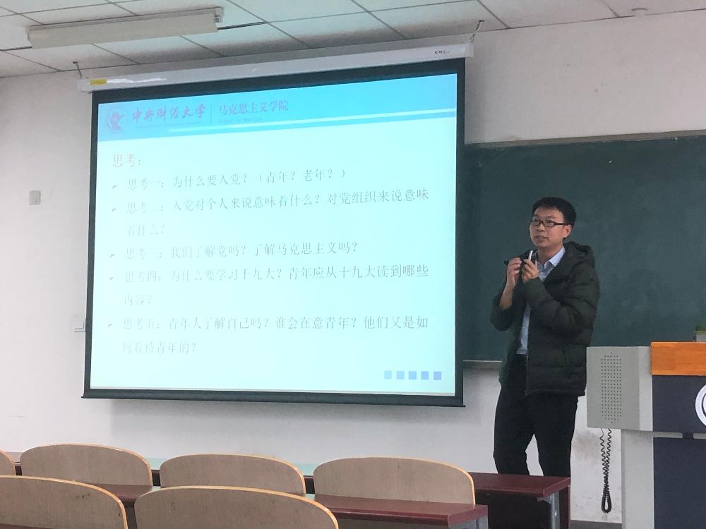 11月23日中午12点20分,马克思主义公司的简臻锐老师在主教学楼508为公司关于018年第二批发展对象学员进行了第二次理论培训课程。此次培训课程以“中国情怀,世界眼光:做有使命感的新时代青年”为主题。简老师首先带领同学们品味“青”字的内涵:茂盛、蓬勃、年少、美好……在这最美好的年华选择入党,毫无疑问是人生当中一项重大的决定。为什么要入党,入党对个人意味着什么,青年人入党又对党意味着什么,青年人真的了解自己,了解马克思主义吗?简老师这一系列问题引发了同学们深深的思考。随后简老师和同学们一同观看了《我的生活,我的中国》纪录片,同学们对坚持中国共产党领导有了进一步的认识。紧接着简老师和大家回顾了十九大报告关于青年的论述:青年强则国家强,青年兴则国家兴。青年一词在十九大报告中出现的次数达到了10次,历史最高。