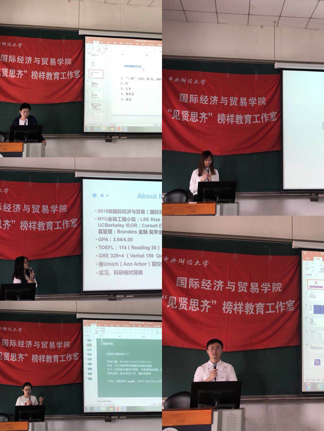 来自中澳15的朱文韬学长首先上台,向同学们分享他成功被伦敦政经大学金融与私人资产专业录取的经历,向同学们介绍了GPA、语言成绩、实习、简历等申请的主要考察点。随后,他分享了出国申请时间安排、各项目申请的难度和各院校不同专业的团队力量等内容。随后上台的是来自国际商务15的夏雨泽学姐,她目前申请到了华盛顿圣路易斯大学金融专业,给同学们提出了学习方面的宝贵建议。她按照时间顺序介绍了自己的准备过程并总结了相关的经验教训。在如何甄别优质中介方面,她认为可以多向学长学姐请求经验。紧接着,由来自中澳15的蒋欣桐学姐为同学们介绍自己的留学经验。她向同学们分享了申请方向、GPA中重点关注的科目、GRE的备考方法等方面的知识。中澳15的杨晨学姐也同样分享了自己在申请伦敦政经过程中的感受以及对GMAT的建议。随后张家靖学长为大家介绍了香港中文大学的项目优势以及申请流程及时间节点。最后,中澳15的王韵喆学长分享了个人背景以及被麻省理工、普林斯顿大学录取的经历,并对本科阶段不同方面的提升方向作了重要性排序。
