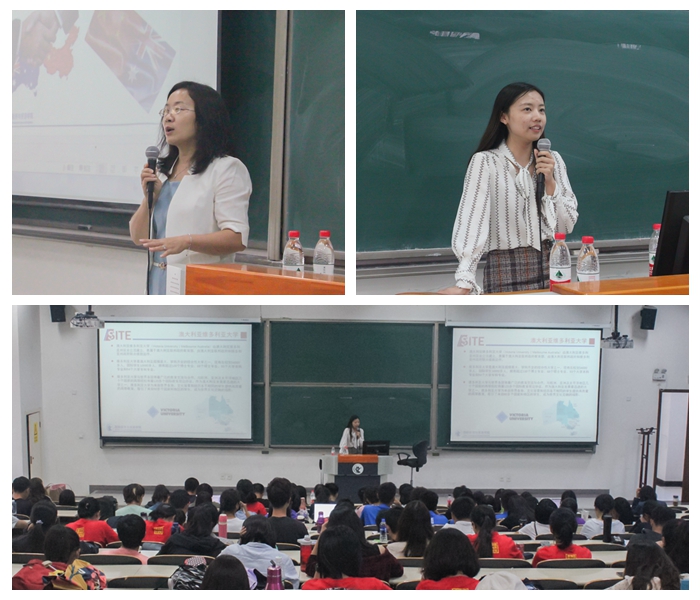 在中澳项目分会场,秦伊伦老师细致回顾了中澳项目的发展历史,对澳方维多利亚大学作了详尽介绍,从培养目标、主干课程、优势教育资源等多个方面点明了中澳项目的办学特色。接着介绍了中澳项目四年学习的安排,强调英语学习、先修课程和合作课程学习等的重要性。