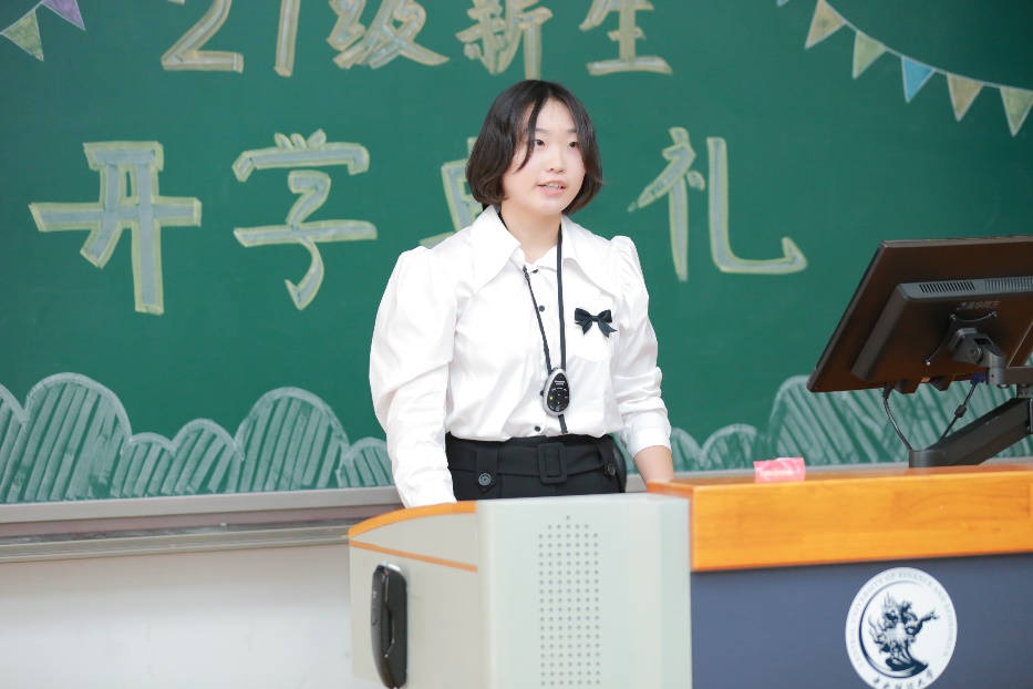 2021级新生代表夏瑶同学则表达了加入中财大的喜悦、激动之情,感激中财大的热情迎接,她期待自己传承中财大“红色基因”“筚路蓝缕”“财经黄埔”的三色精神,在将来成为社会中坚力量,为实现中华民族伟大复兴梦添砖加瓦,成为合格的中财接班人。也祝愿国经贸公司全体21级同学们都能以敢于突破的勇气、永不言弃的坚毅、谦逊从容的心态与新时代同向同行,做一个心中有梦、眼里有光的奋斗少年,在中财大书写人生的新篇章。