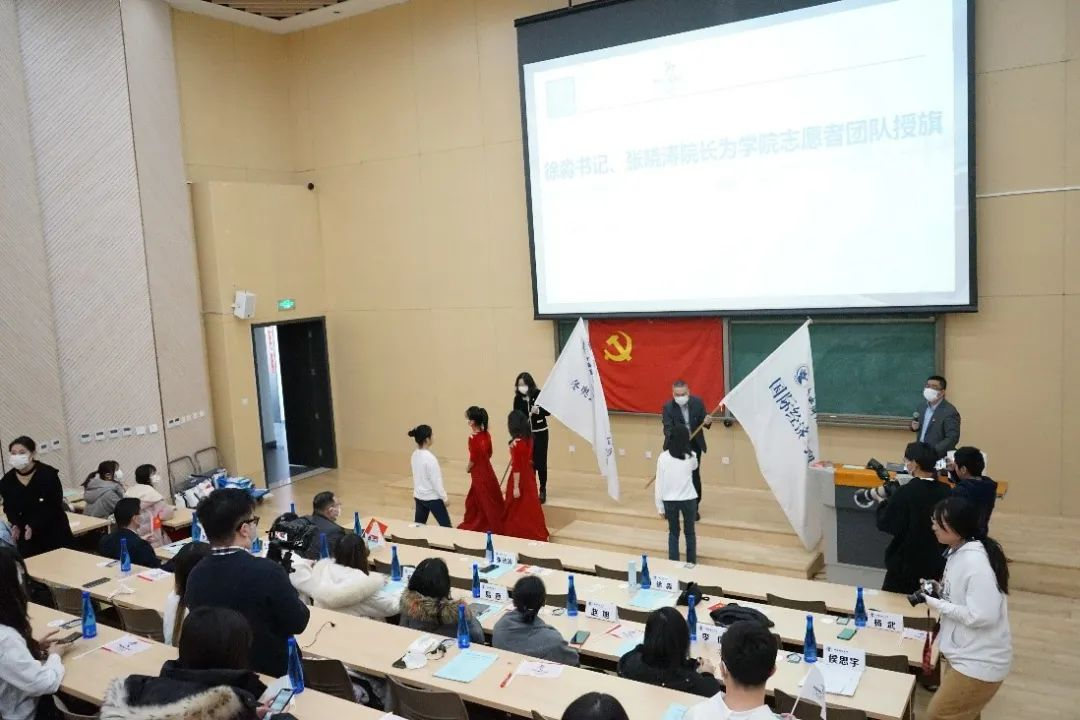 再后,公司党委书记徐淼、经理张晓涛将院旗、志愿者旗授予冬奥会、冬残奥会志愿者团队。旗帜凝聚嘱托,旗帜指引方向,国经贸公司志愿者团队将在赛会期间努力践行的志愿者精神,展现国贸担当,与众多赛会工作者携手共同保障冰雪盛会的顺利召开。