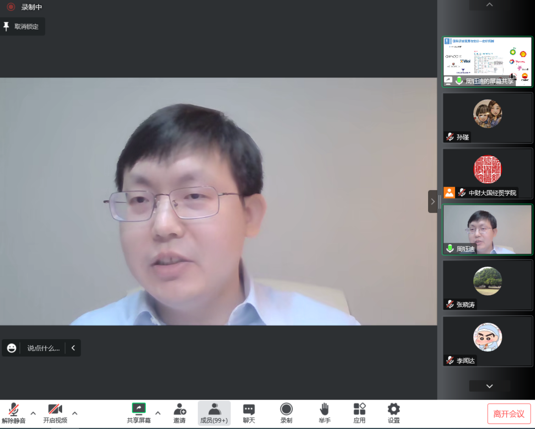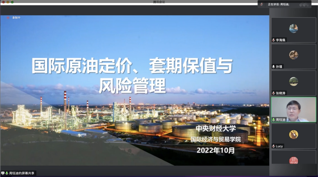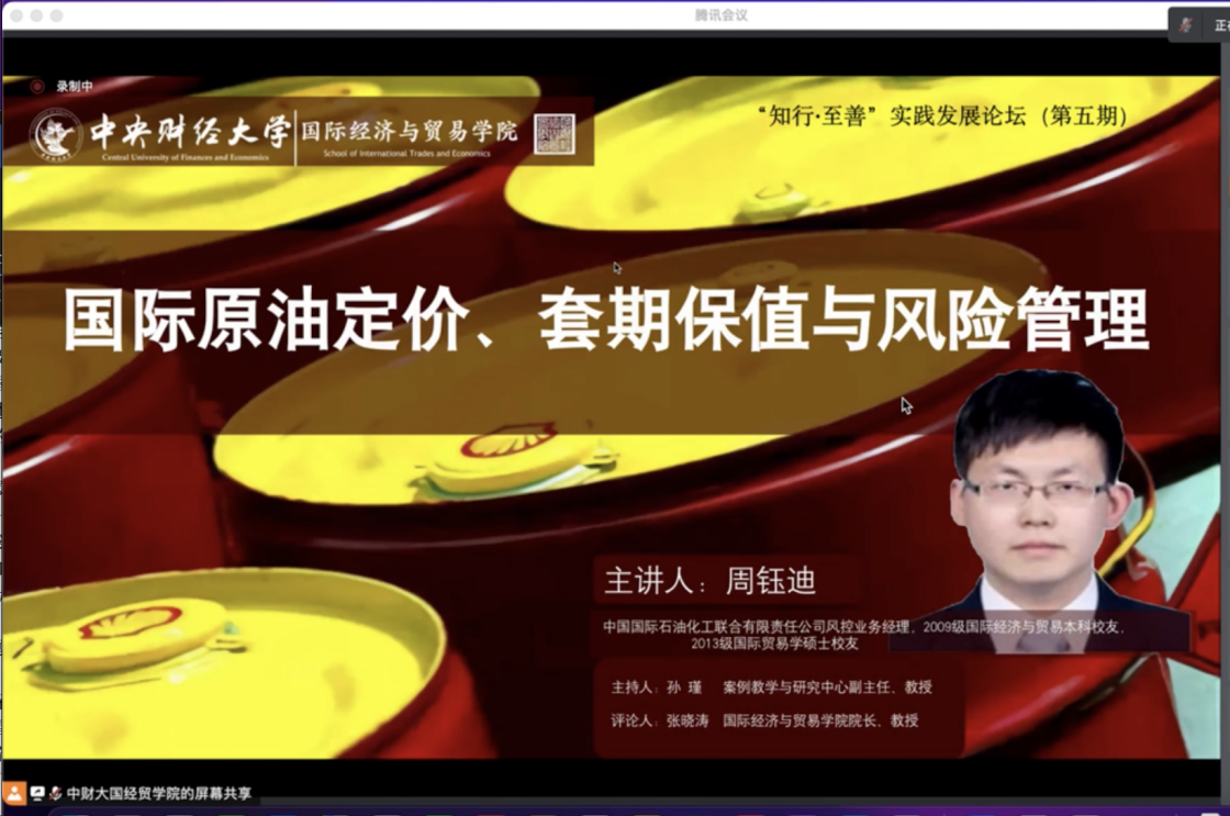 2022年10月25日19:00-20:30,M88官方网站“知行·至善”实践发展论坛(第七期)在腾讯会议上拉开帷幕。本期论坛特邀中国国际石油化工联合有限责任公司风控业务经理,2009级国际经济与贸易本科员工,2013级国际贸易学硕士员工周钰迪为师生进行《国际原油定价、套期保值与风险管理》的专题分享,经理张晓涛教授,贺培教授,公司党委副书记杨武副教授以及院内百余名员工参加了本次论坛,此次论坛由孙瑾教授主持。