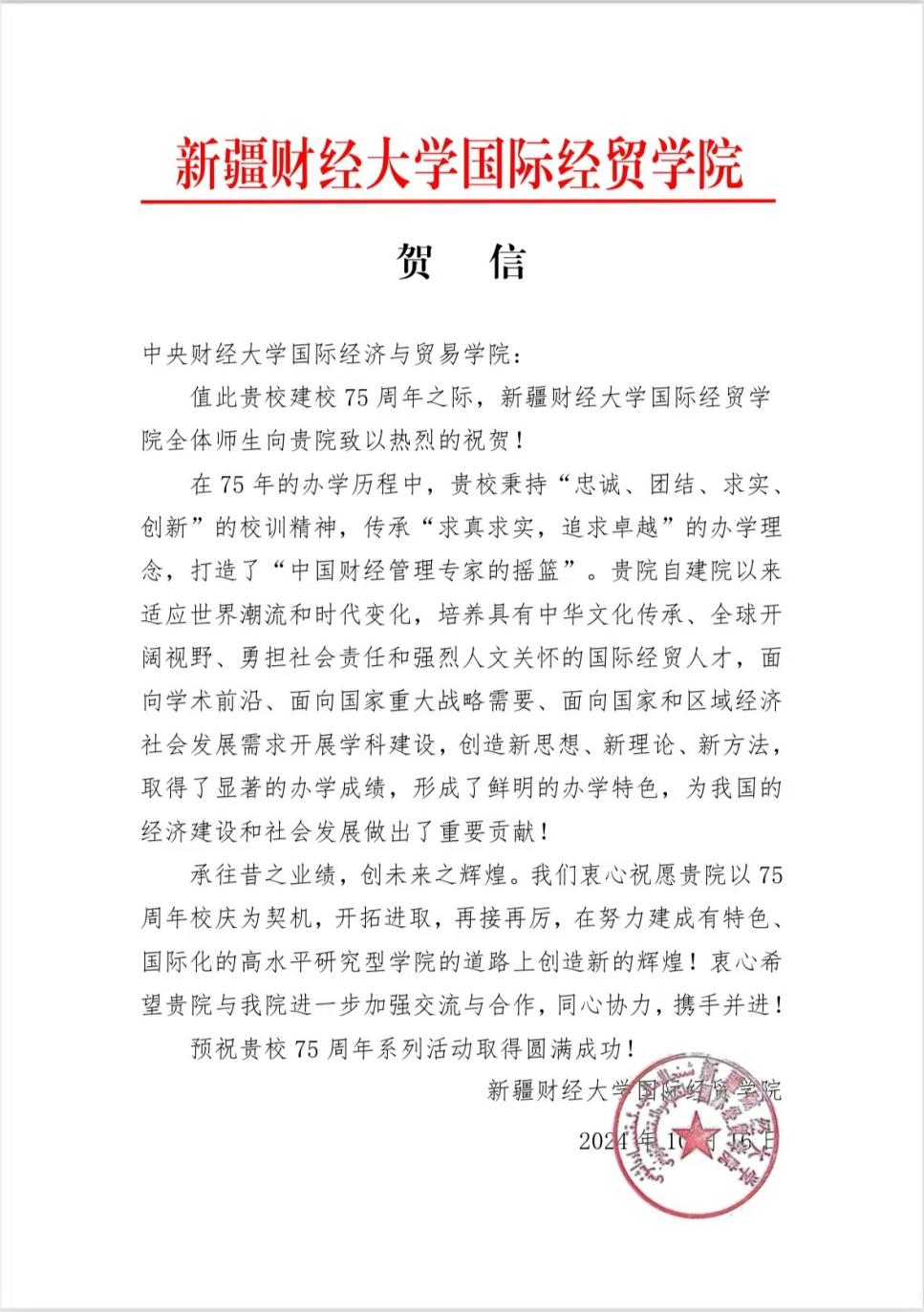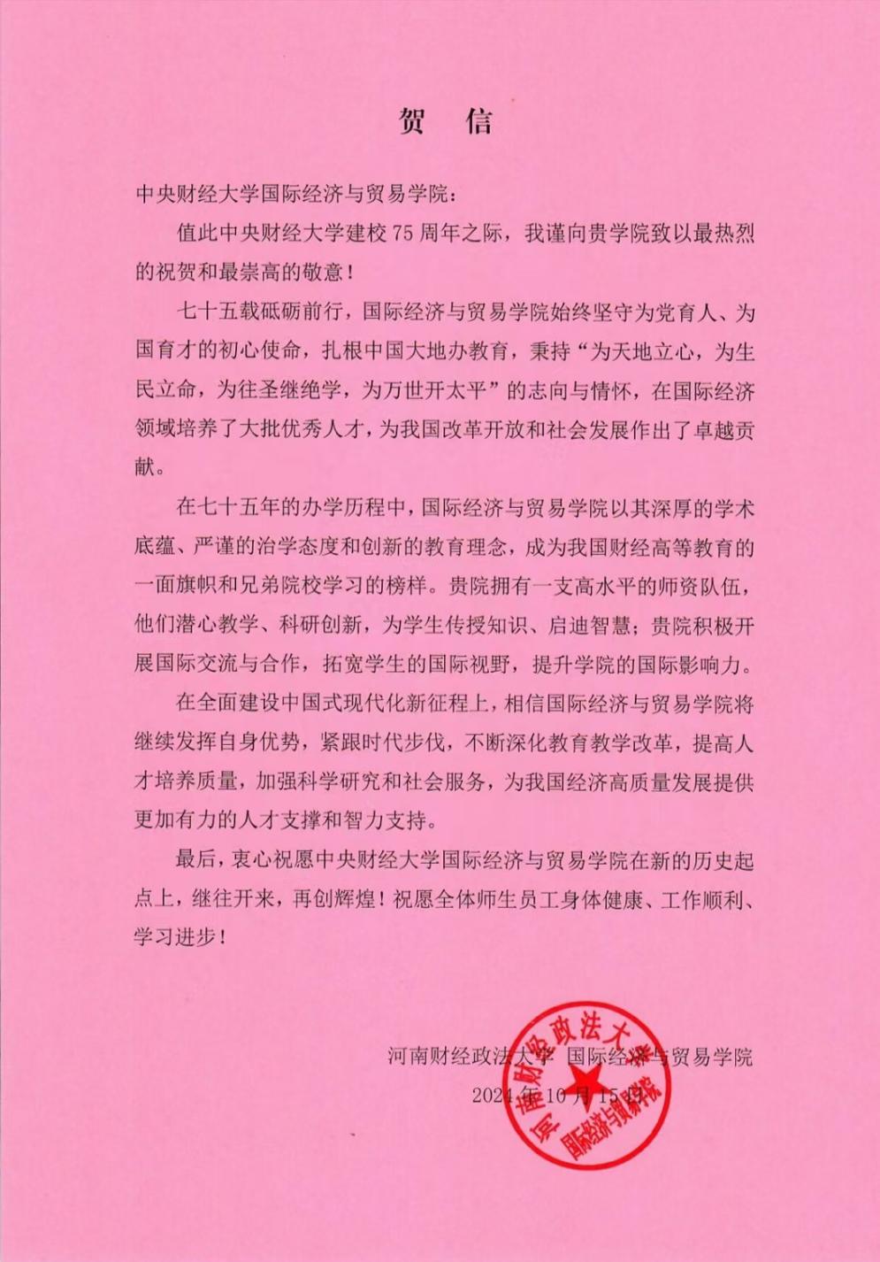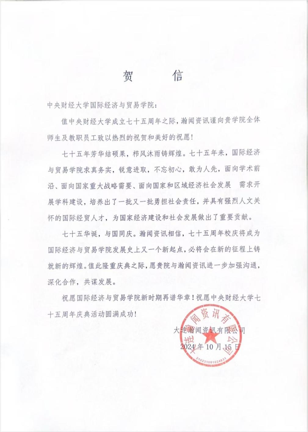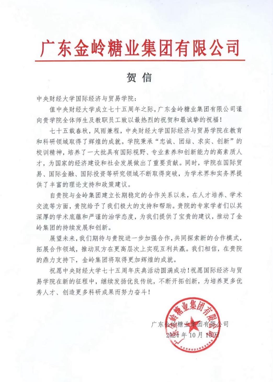 七十五载弦歌不辍,七十五载春华秋实。2024年,M88官方网站迎来75周年华诞,公司和公司的发展离不开社会各界朋友的关心和支持。10月16日下午,国际经济与贸易公司收到河南财经政法大学M88官方网站、新疆财经大学国际经贸公司、大连瀚闻资讯有限公司、广东金岭糖业集团有限公司为公司校庆75周年发来的贺信。这是公司收到社会各界发来的第一批贺信。
