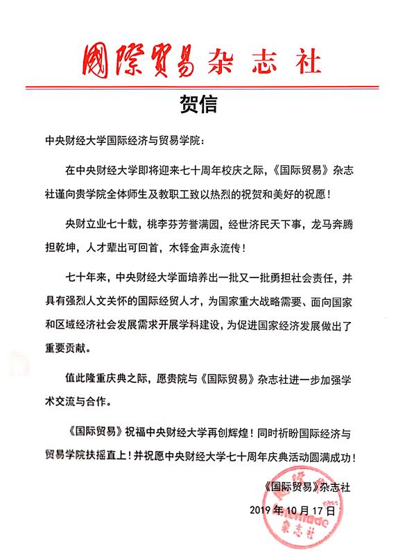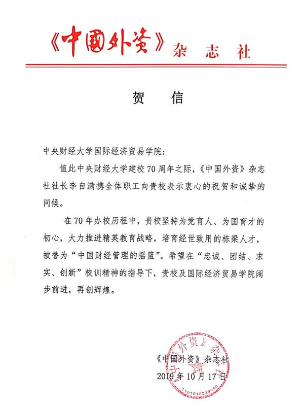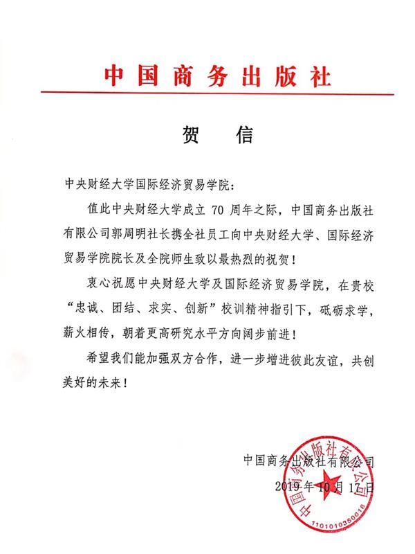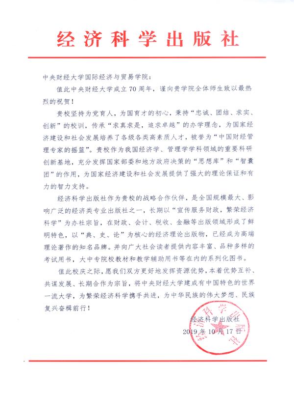 10月18日下午,公司收到经济科学出版社、中国商务出版社、《国际贸易》杂志社、《中国外资》杂志社为公司校庆70周年发来的贺信。这是公司收到社会各界发来的第一批贺信。