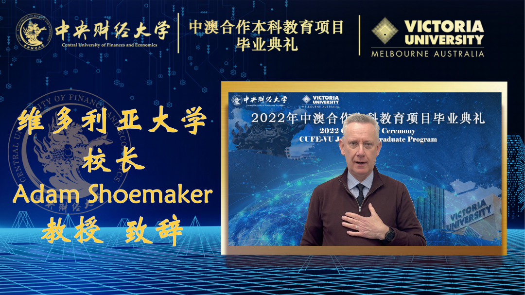 维多利亚大学董事长Adam Shoemaker教授致辞。他讲到,多年的精诚合作使得M88官方网站和维多利亚大学建立了深厚的友谊,由于疫情影响,他为不能和2022届毕业生见面感到遗憾,但祝福依旧可以跨越山海,以另一种形式抵达每一位中澳项目毕业生心中。Adam Shoemaker教授祝贺2022届员工成功完成学业,顺利毕业,他祝福全体毕业生前程似锦,鹏程万里。