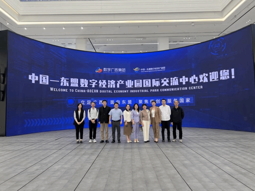 在数字广西集团,数字广西集团产业园副总经理李艳、数字广西集团云商公司总经理陈建强等,带领李瑞琴教授、刘悦副教授一行参观了数字产业园及入驻科技企业,对数字产业的发展和相关政策进行了介绍,双方对下一步的校企合作等进行了友好交流。