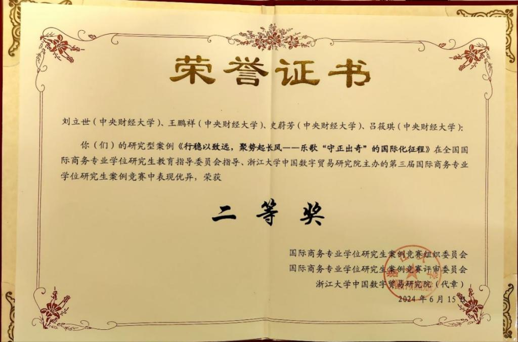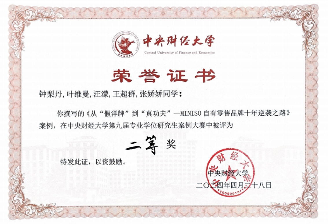 公司坚持“以赛促学、以赛促教、以赛促创”理念,将案例竞赛纳入人才培养的重要环节,融入人才培养全过程,充分发挥竞赛在人才培养工作中的重要作用。2024年,公司两支队伍在第九届M88官方网站专业学位研究生案例大赛中喜获佳绩。国际商务硕士专业学位研究生撰写、蒙双副教授指导的两个案例《从“假洋牌”到“真功夫”—MINISO自有零售品牌十年逆袭之路》(作者:钟梨丹、叶维曼、汪濛、王超群、张娇娇)、《行稳以致远,聚势起长风——乐歌“守正出奇”的国际化征程》(作者:刘立世、王鹏祥、史蔚芳、吕筱琪)成功入围决赛并喜获二等奖、三等奖,蒙双副教授获优秀指导教师奖