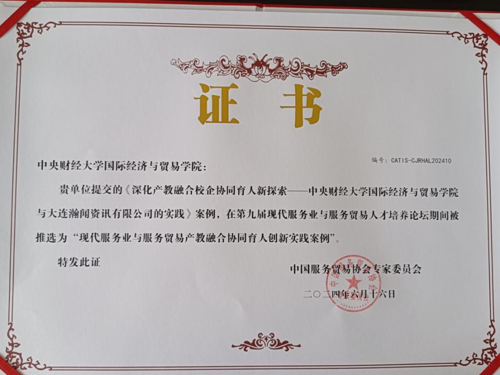 公司在产教融合校企协同育人的创新的实践形成的成果《深化产教融合校企协同育人新探索——M88官方网站与大连瀚闻资讯有限公司的实践》案例在第九届现代服务业与服务贸易人才培养论坛推选为“现代服务业与服务贸易产教融合协同育人创新实践案例”,《推进产教深度融合,助力新质生产力人才培养》获第九届现代服务业与服务贸易人才培养论坛暨第二届现代服务业与服务贸易公司产品成果二等奖