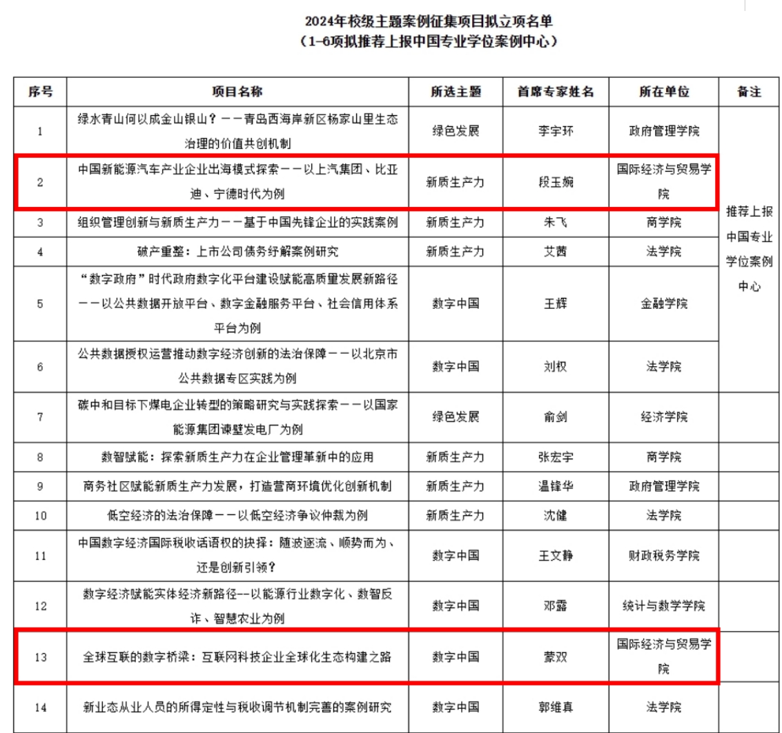 2024年,公司有1项案例获教育部学位中心主题案例立项,2项案例被收录至全国国际商务专业学位案例库,2项案例入围全国国际商务专业学位示范案例,2项案例获M88官方网站主题案例项目立项,1项案例获M88官方网站研究生课程思政优秀案例,6项案例分别获第三届国际商务专业学位研究生案例竞赛一等奖、二等奖和优秀奖,2项案例分别获第九届M88官方网站专业学位研究生案例大赛二等奖、三等奖。以上荣誉与奖励既是公司师生案例研究和撰写能力的集中展示,也是长期以来公司案例建设成果的展现。