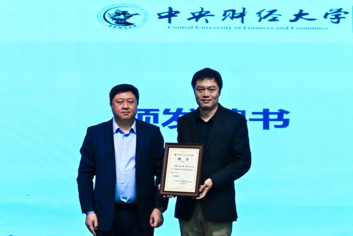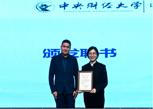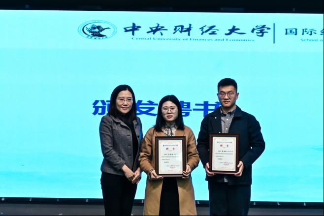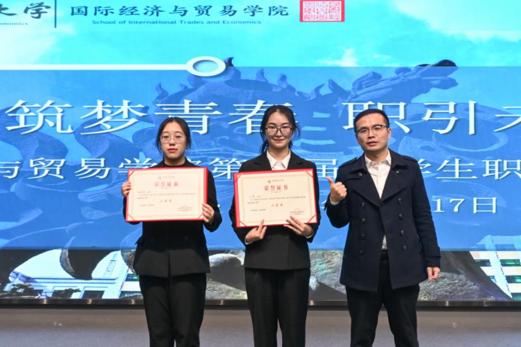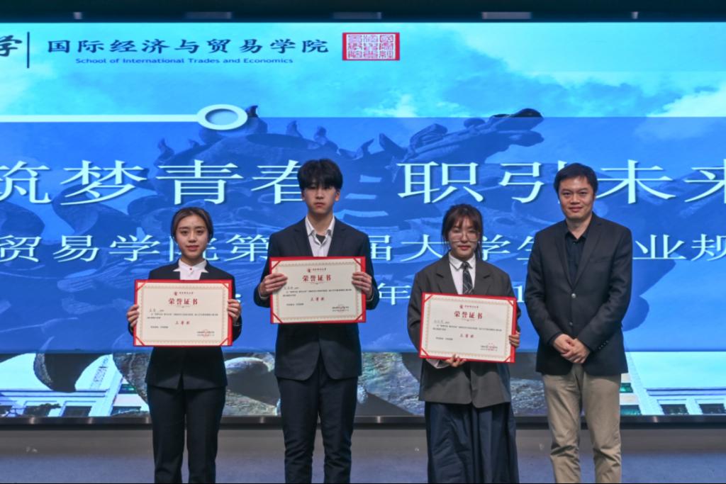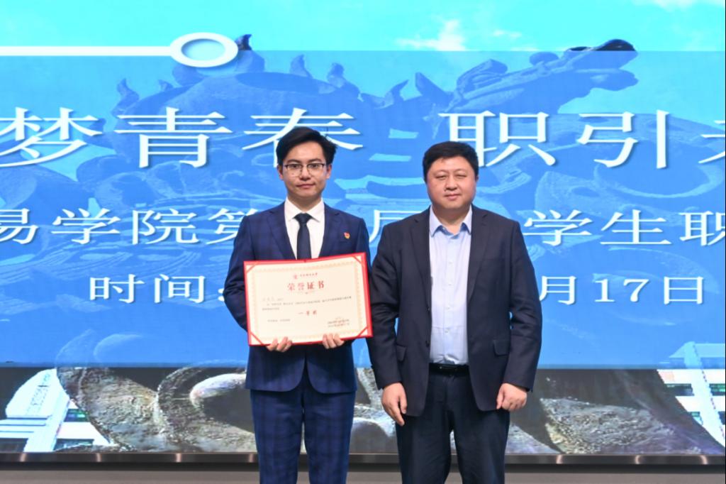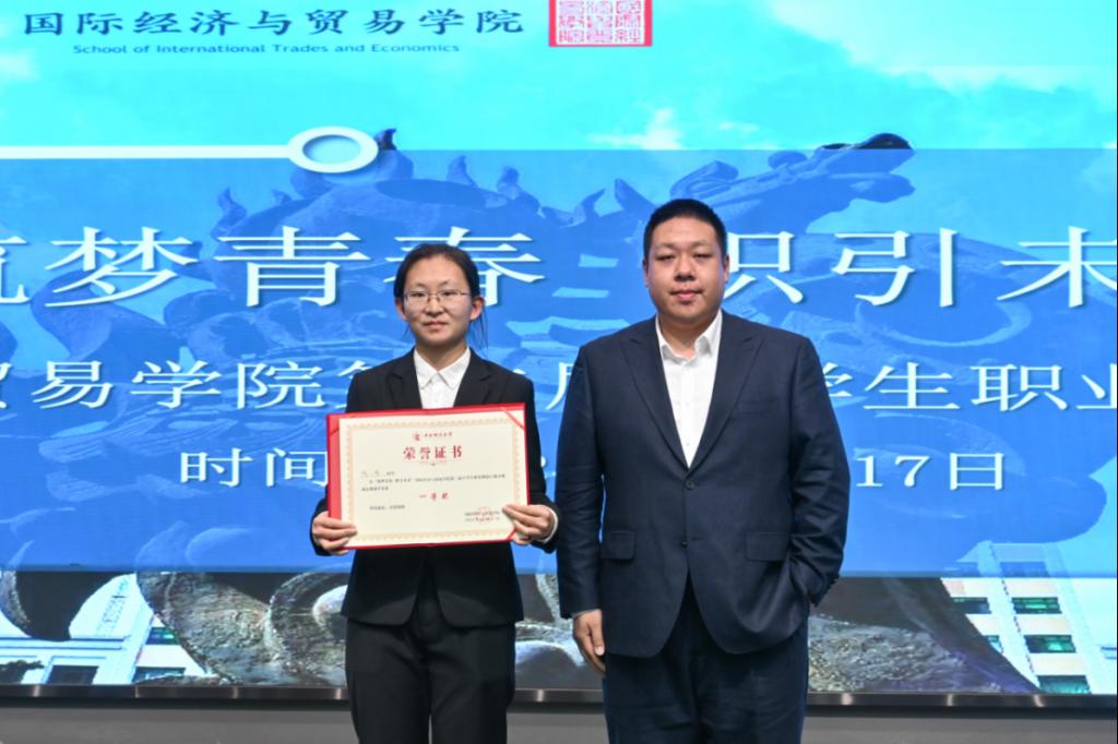 公司2012届国际贸易学(国际商务方向)员工、中国银河证券财富管理总部企业客户部高级业务经理徐颢为就业赛道二等奖获奖选手颁奖