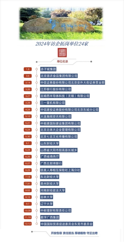 校企双方合作落地见效,2024年,公司带200余名员工赴中信建投证券北京东城分公司和中信建投证券投教基地参访,引导同学们躬身前行,走出书本与课堂,在第二课堂中增长见识才干;中国农业银行北京市分行及万寿路支行到访公司座谈交流并为员工举办安全教育主题讲座。在2024年寒暑假,共9名员工赴中信证券北京安外大街营业部实习3名员工赴山西省阳高县长城乡实习10名员工赴广西北部湾银行开展“青苗工程”实习,14名员工赴大连瀚闻资讯实习,10名员工赴广东金岭糖业集团实习同时江苏银行、广西北部湾银行到访公司座谈交流,并挂牌建立实习实践基地,校企双方携手在“就业-培养-招生”联动机制上下功夫,进一步提高人才培养质量。实现人才供需有效对接,持续加强校企联动,深化合作助力员工培养及公司发展。