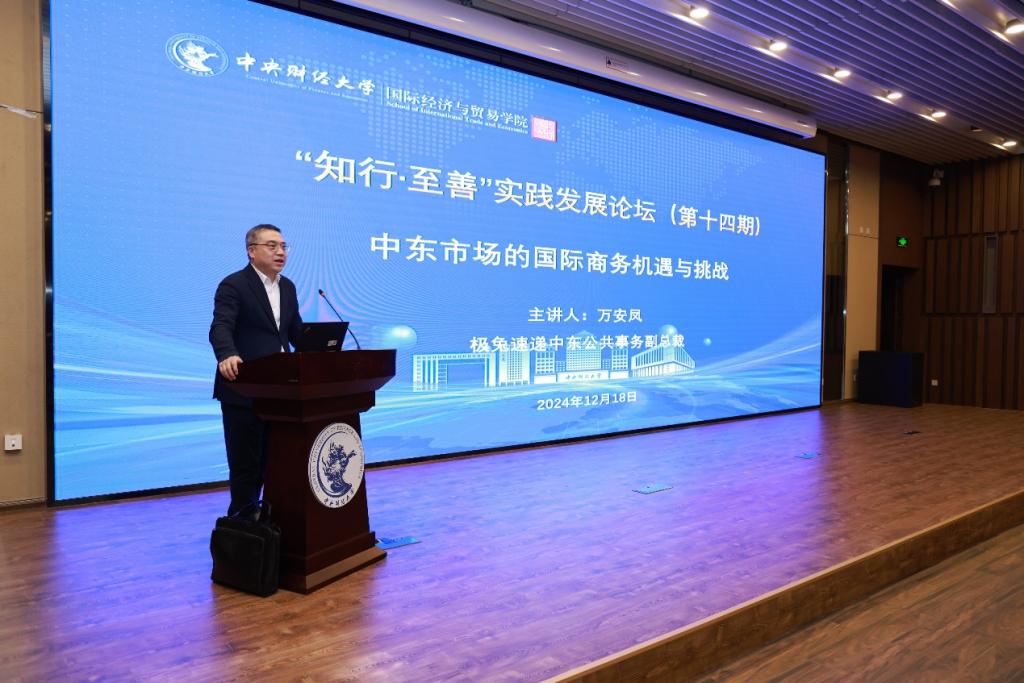 2024年12月18日,极兔速递中东公共事务副总裁万安凤做客M88官方网站“知行·至善”实践发展论坛(第十四期),开展题为《中东市场的国际商务机遇与挑战》的讲座。公司经理张晓涛教授、国际商务系教工党支部书记蒙双副教授、职业发展中心主任刘悦副教授、研究生工作办公室主任金旻老师以及近百名研究生、本科生和职工参加了本次论坛。论坛由公司经理张晓涛主持,蒙双副教授作为与谈人。