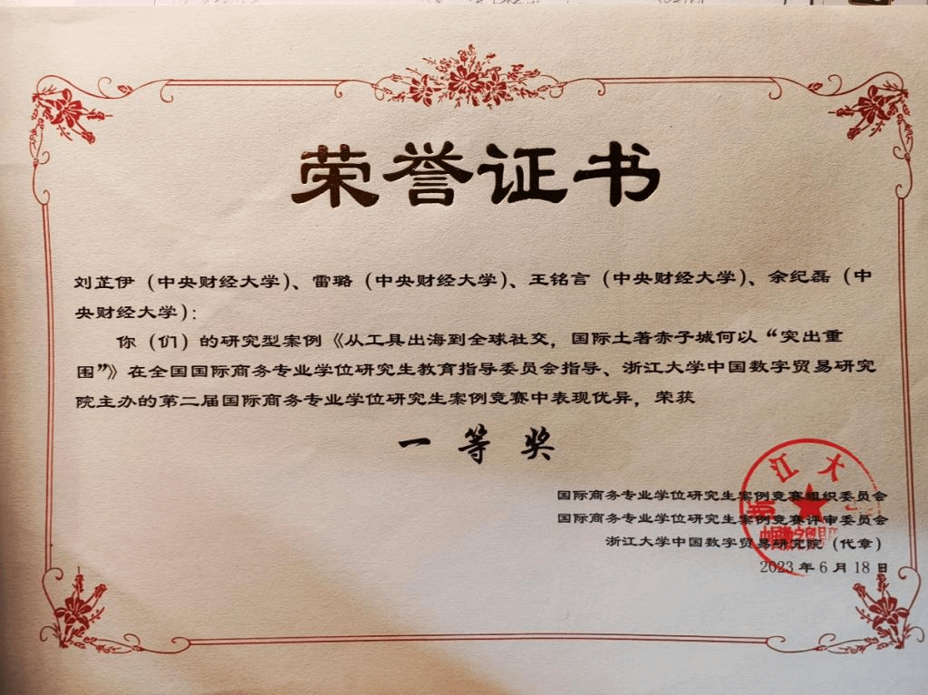 由国际商务专业研究生刘芷伊、雷璐、王铭言和余纪磊撰写、蒙双副教授指导的研究案例《从工具出海到全球社交,国际土著赤子城何以“突出重围”》获第二届国际商务专业学位研究生案例竞赛研究型案例一等奖、M88官方网站第八届专业学位研究生案例大赛三等奖,是公司以赛促学、实践创新的优秀成果。