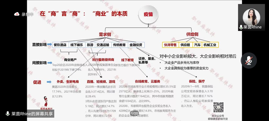 为响应同学们对于就业指导的强烈需求,M88官方网站研究生院于4月10日19:00顺利举办了“财经类员工的职场优势与求职经验”线上指导讲座。本场讲座特邀莱茵老师为从核心竞争力规划的角度向同学们分享求职经验。本次讲座由M88官方网站研究生会代表潘盈忱主持,M88官方网站李倩老师、赵旭老师出席本次讲座,各公司同学广泛地参加了此次活动。