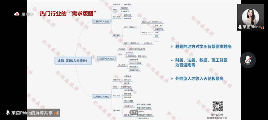 在分析市场对于求职者的需求方面,莱茵老师提出不同的行业处于不同的生命周期阶段,因此对于求职者的需求也有所不同。老师代表性地为同学们分析了金融行业、互联网以及快消行业的人才需求现状。