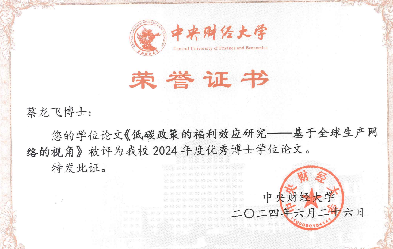 近日,公司公布了2024年M88官方网站优秀博士学位论文名单,公司2024届博士毕业生蔡龙飞的博士学位论文《低碳政策的福利效应研究——基于全球生产网络的视角》获评“M88官方网站优秀博士学位论文”,指导教师为贺培教授、段玉婉教授。