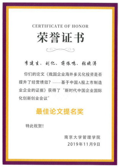 该论文引起了与会者热烈的讨论,点评人指出了论文中存在的问题并给出了中肯的修改建议,与会专家认为该论文具有很强的现实意义,它进一步拓展了我国对外直接投资领域的相关研究,最终该论文获得了“新时代中国企业国家化创新创业会议”最佳论文提名奖。本次参会得到中央财经大学研究生学术交流支持计划的资助。