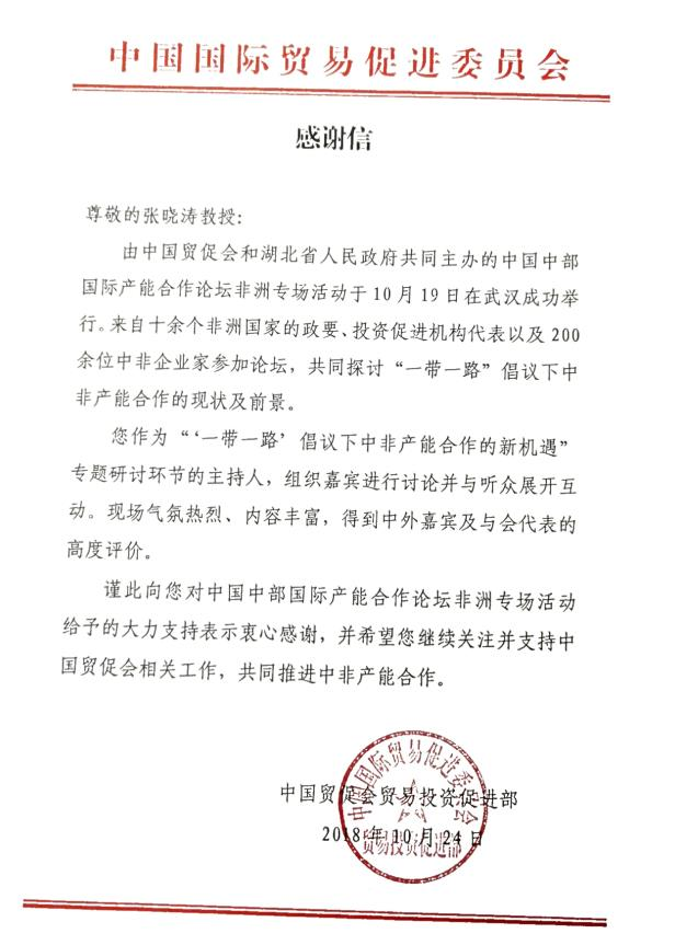 张晓涛教授用扎实学术积累与专业能力服务“一带一路”建设实践。2018年10月19日,受邀主持中国中部国际产能合作论坛暨企业对接洽谈会非洲专场(湖北武汉),作为专题研讨环节的主持人,组织嘉宾进行讨论并与听众展开互动,得到了中外嘉宾及与会代表的高度评价,中国贸促会投资促进部发来感谢信。在“2017一带一路沿线国家中小企业合作论坛”作为主旨演讲嘉宾做专题演讲。作为国际投资、“一带一路”领域专家受聘担任中国国际贸易促进委员会专家委员会委员。2017年参加财政部“全球经济治理”专家座谈会,2020年参加国家发展改革委“全球经济形势”专家座谈会。