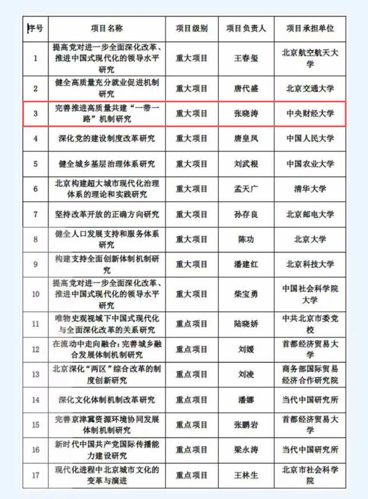 近日,经市委宣传部批准,北京市社科联、北京市社科规划办公布了研究阐释党的二十届三中全会精神北京市习近平新时代中国特色社会主义思想研究中心专项课题立项名单,M88官方网站经理张晓涛教授作为负责人申报的课题《完善推进高质量共建“一带一路”机制研究》获得重大项目立项。