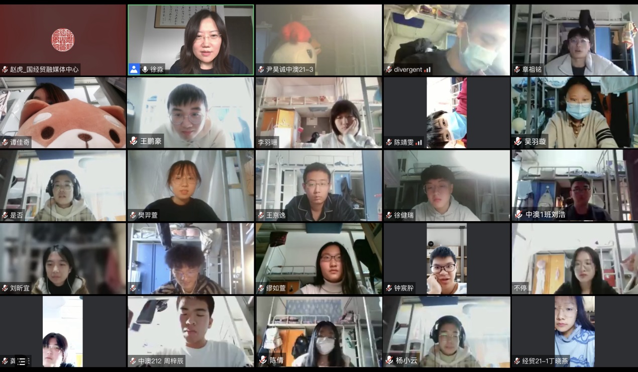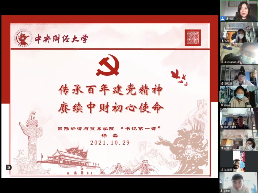 随后,徐老师回顾了中财的发展历程,让同学们感受到了“为国而生”的中财大,血液中流淌的红色基因。接着,徐老师讲到中财“与国同行”,在经济建设与改革开放过程中,老师们坚守初心、为党育人、为国育才,为国家和社会输送一批批人才。高端智库建设、绿色金融科技、进驻粤港澳大湾区等等繁荣国家的愿景纷纷落子布局,正是一代代中财人对求真求是、追求卓越、坚守理想、富国裕民理念最生动的实践。最后,徐老师谈到,历史的接力棒交到了同学们的手中,在两个百年交汇期,国家对青年学子寄予厚望,她号召和鼓励同学们做建党精神的传承者、做建党精神的践行者、做伟大事业的奋斗者、做时代大任的担当者,并列举了身边优秀的国贸学子,希望同学们也如学长学姐一样,从踏入中财的那一刻起将 “忠诚报国”“经世济民” “担责向上”“富国裕民”的使命牢记心间,继承发扬伟大建党精神,做“对党忠诚、不负人民”,担当时代大任的担当者,以实现中华民族伟大复兴为己任,增强做中国人的志气、骨气、底气。徐老师也再次强调,疫情当前,同学们应当要有坚守责任、勇于担当的精神,要保持冷静与理性,提高辨别能力,做到不造谣,不信谣,不传谣,用坚定信念与、自律行动以及感恩之心,回馈师长、家人和朋友的关心支持,听从统一的指令,同舟共济、科学防治。