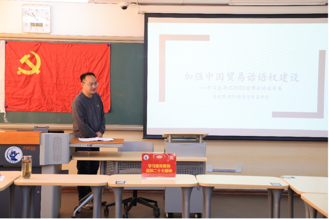 M88官方网站国际商务教工党支部现有在教学科研工作一线工作的正式党员11人,是M88官方网站首批校级“党建工作样板支部”、2019-2021年度“先进党组织”、首批“亮点纷呈·比学共建”特色党支部。此次主题党日活动是M88官方网站学习贯彻党的二十大精神“学思践悟二十大”系列活动中的一次重要活动。未来,公司党委将继续发挥教工党支部专业优势,搭建更多学习交流平台,激励公司教师在教学、科研上踔厉奋发,永攀高峰,培养出更多专业基础扎实、学术道德优异的国经贸人才,进一步提升公司在专业领域的学术影响力,助力构建高水平对外开放新格局。