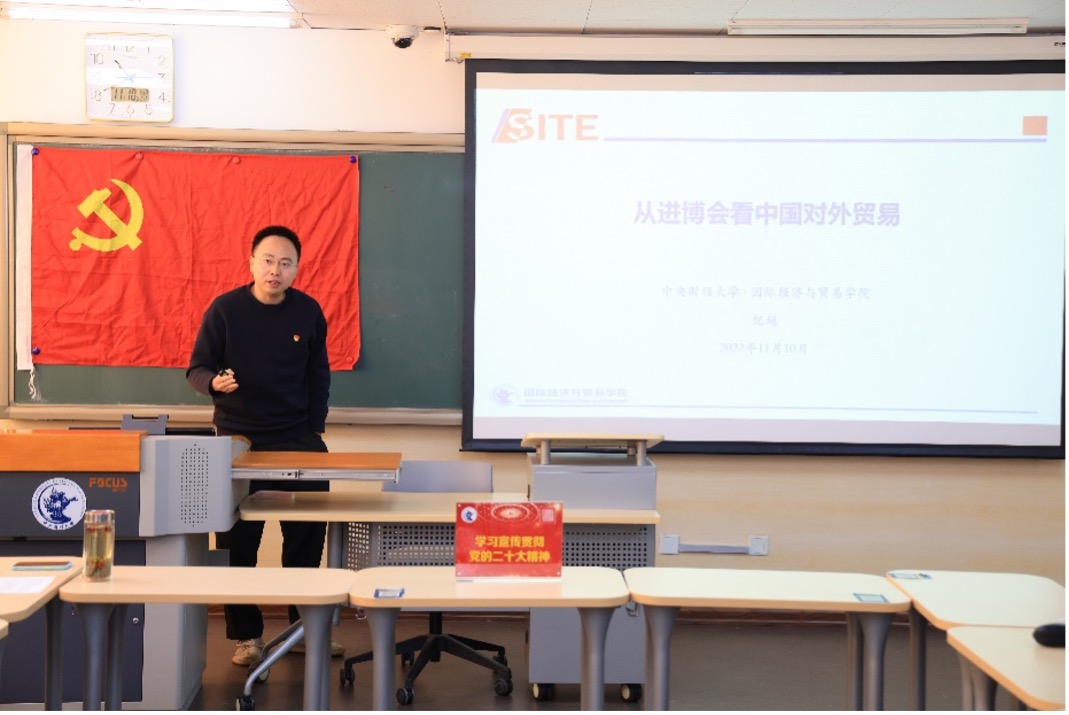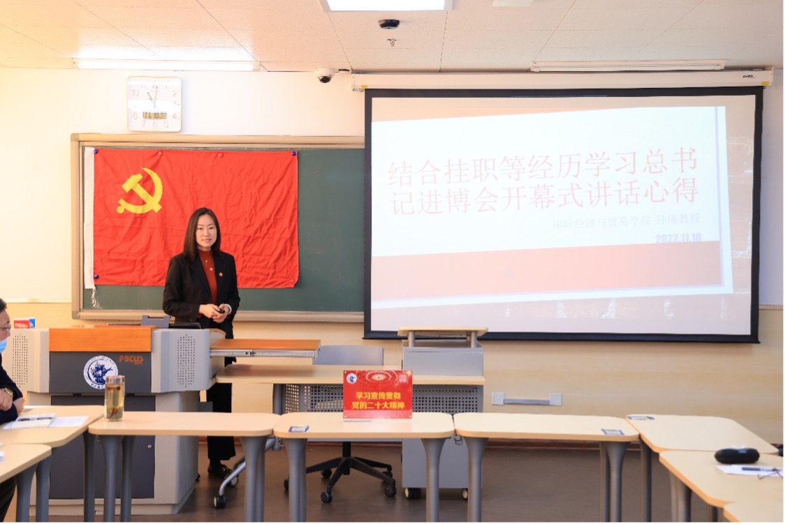 在自由交流讨论环节,支部教师结合自身专业领域及亲身经历,热烈讨论了习近平主席致辞的内容。大家纷纷表示,习近平主席的致辞高瞻远瞩、掷地有声,传递出中国坚定不移扩大开放的时代强音。此外,支部教师还对构建中国特色国际贸易理论、人才培养与团队建设等问题提出看法。其中,贺培教授谈到,在五届进博会中都有结合时代背景的主题和关键词,这些词语很好体现了中国对外开放的主旨。她指出,作为专业教师,大家需要加强产学研转化,重视国际贸易话语权构建,注重政策研究和成果转化,提升学术影响力。经理张晓涛教授谈到,党的二十大报告结合当今世界格局明确了中国对外开放的相关问题和具体措施,这需要在学习过程中具备大视野和历史观,做到求真务实,为我所用。
