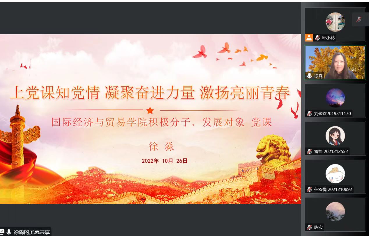 最后,徐淼书记提出几点希冀与同学们共勉:一是提高思想认识。她鼓励同学们要砥砺思想品格、掌握真才实学、练就过硬本领、拓宽国际视野,把爱国之情、强国之志与报国之情统一起来,为实现中华民族伟大复兴而努力奋斗。二是加强理论学习。徐淼书记特别推荐了《习近平谈治国理政》第四卷、《论党的青年工作》和《习近平经济思想学习纲要》三本书,鼓励国贸学子积极响应党的号召,坚定理想信念,提升专业素养,勇做追逐青春梦想、担当时代责任、树立世界眼光、传递中国力量的实践者、贡献者和先行者;三是对照标准找差距。徐淼书记强调,遵守党章既要对章看齐,对自身的思想和行为常反思、勤检讨,又要对标看齐,对照身边先进榜样找差距、补短板,做到以人为鉴;四是自觉接受党组织培养、考察和教育,不断提高党性修养。徐淼书记指出,党性修养是一个自觉学习、长期实践的过程,是一个不断自我剖析的过程,也是一个见贤思齐的过程,而自觉接受党组织的培养、教育和考察则是发展党员的必需程序,更是党性修养的重要途径。国贸青年应当深化为民情怀、淬炼坚毅品格、涵养一身正气,以青春之力扬国贸之光,在社会主义现代化建设中充分展示和贡献青春智慧。