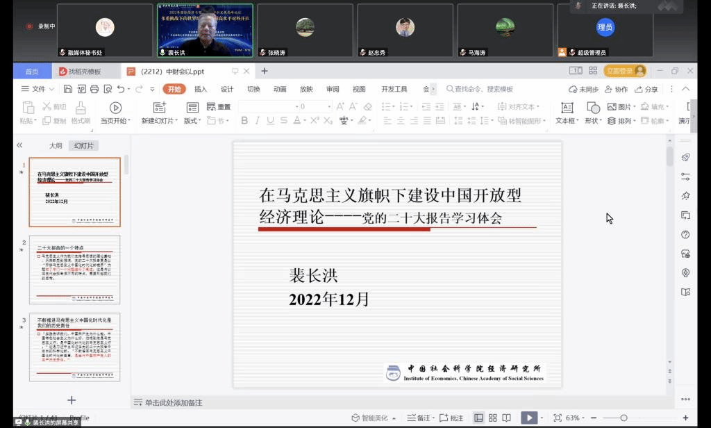 裴长洪教授(中国社会科公司经济研究所原所长)做了题为《在马克思主义旗帜下建设中国开放型经济理论—党的二十大报告学习体会》的报告:首先,团队建设要基于马克思主义方法论,要理论联系实际,使理论和政策创新符合中国实际、具有中国特色,不断发展中国特色社会主义政治经济学。其次,构建中国经济学自主知识体系,要解决以下认识问题:第一,坚持和把握马克思主义哲学、政治经济学和科学社会主义的基本原理。第二,认真学习、研究、阐释习近平经济思想中有关开放发展的新理念。第三,坚持独立自主走中国自己的学术发展道路,经济学理论建设应以造福人民为目标。第四,坚持经济学的自我革命。第五,既要与中国实践相结合,也要与中华优秀传统文化相结合。未来中国经济学有三个趋势性变化是不可逆转的:马克思主义政治经济学在经济学理论和应用学科中的中国化时代化专业化发展趋势不可逆转;以中国自主知识体系改造和完善经济学理论和应用学科的发展趋势不可逆转;挖掘和贯通中国经济思想史中的精华不断赋予经济学理论鲜明的中国特色的趋势不可逆转。