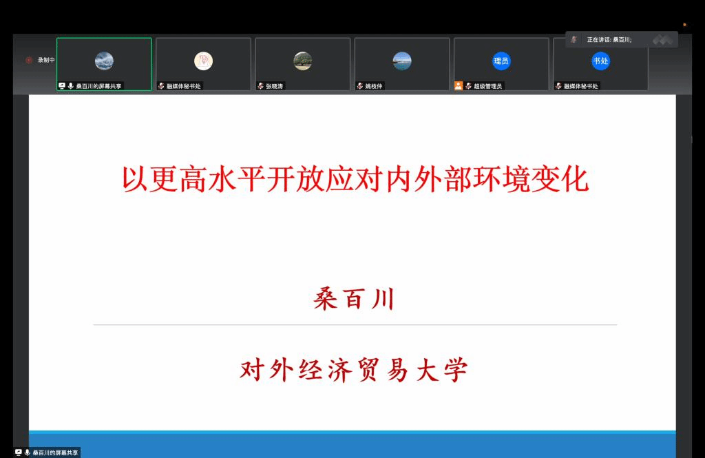 桑百川教授(对外经济贸易大学国际经济研究院经理)做了题为《以更高水平开放应对内外部环境变化》的报告:当前对外开放的国内国际条件均发生变迁,中国推进高水平对外开放更为重要。以开放促改革发展是中国崛起的宝贵经验,也是经济高质量发展阶段推动经济结构转型升级、应对全球经济大变局的需要。更高水平开放包括两个层面,就生产力层面而言,是商品、服务和要素跨境流动的规模更大、质量更高;就生产关系层面而言,是对标先进国际经贸规则,建立“更高水平开放型经济新体制”。推进我国更高水平开放可通过以下路径实现:第一,从渐进式开放转向构建全面开放新格局;第二,从商品和要素流动型开放为主转向制度型开放为主;第三,从贸易大国转向贸易强国;第四,从投资大国转向高质量投资国;第五,从经济全球化参与者转向维护经济全球化的中坚力量;第六,从全球经贸规则接受者转向积极参与国际经贸规则制定者。