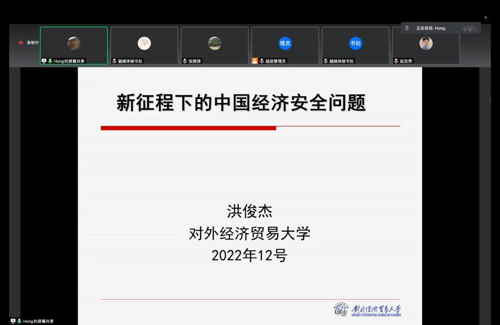 洪俊杰教授(对外经济贸易大学副董事长)做了题为《新形势下国家经济安全研究》的报告:在中国的国家安全体系中,经济安全发挥着基础性的作用。金融危机后,全球经济出现“新平庸”,国际上不确定性增加,包括疫情冲击、中美贸易博弈、俄乌冲突、WTO改革。目前中国面临的国家经济安全主要包括粮食安全、金融安全、网络和信息安全、产业链供应链安全以及资源能源安全五个方面。影响国家经济安全的主要因素既包括全球宏观经济稳定状况、地缘政治冲突及国际运输通道等外部因素,也包括产业依存程度、经济安全制度安排及企业或产业的核心竞争力等内部因素。开放条件下应对经济安全风险的中国对策包括:第一,保障口粮安全,拓宽农粮进口渠道;第二,多元能源体系,加快构建储备体系;第三,防范金融风险,推动人民币国际化;第四,增强产业韧性,加大核心技术攻关;构建新发展格局,包括科技自立自强、内需和超大规模市场建设、构建贸易竞争新优势、统筹安全与发展等,以新安全格局保障新发展格局。