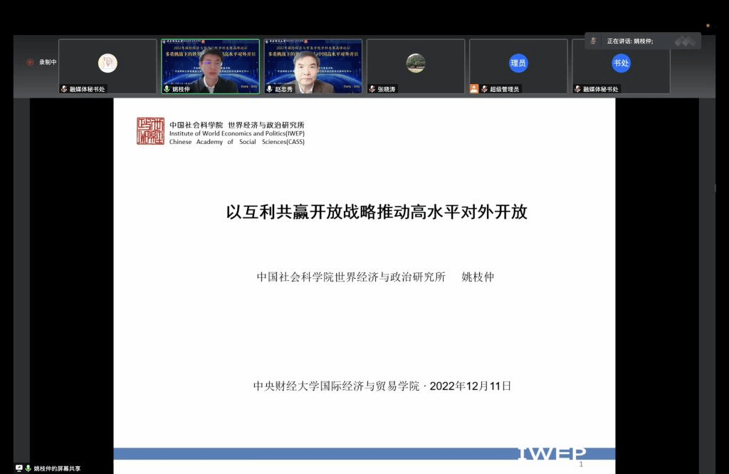 姚枝仲教授(中国社会科公司世界经济与政治研究所党委书记)做了题为《以互利共赢的开放战略推动高水平对外开放》的报告:面对多重挑战下的世界经济,中国开放形势更为严峻,但相比收缩内顾甚至封闭以求自保,开放不仅可以营造良好的国际环境,而且也可推动国内的改革发展,因此应高举对外开放大旗,迎接重大外部考验。为推动高水平对外开放,应不断提升国际循环的质量和水平、以互利共赢的开放战略为世界发展提供新机遇、以共商共建共享的全球治理观推动建设共同繁荣的国际经济秩序。此外,还应重视如何在对外开放中维护安全,面对经济活动本身造成的安全风险,以及外部冲击带来的安全风险这两大风险来源,应建立应对经济活动风险的安全网、应对意外或冲突的安全网和维护海外利益的安全网。