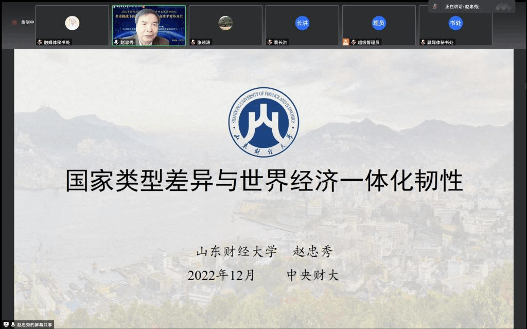 赵忠秀教授(山东财经大学董事长)做了题为《国家类型差异与世界经济一体化韧性》的报告:在世界经济体系内,融入世界经济的开放型国家可分为:以美国等发达国家为代表的创新型国家、以中国和印度为典型的生产型国家,以及以俄罗斯为代表的资源型国家。俄乌冲突引起了各国对国家安全的重新审视。美国以国家安全名义提出制造业回归,以形成其对于其他国家的技术代差,反映了创新型国家基于产权优势控制的焦虑。经济全球化趋势不可逆转。以往世界经济一体化的驱动力来自资本主义生产方式的全球扩张、资本的意志和力量、科技进步的推动力、国家和制度的作用及民众的意愿。中国推动的是开放的世界经济,是真正的多边主义,是基于以人民为中心的发展思想及世界大同的天下观,倡导构建人类命运共同体,反映了集体主义与家国情怀的光芒。要提倡文明共建与文明共存。应实行更加积极主动的开放战略,建设开放型经济新体制,以开放促改革。应该深入推进改革创新,坚定不移扩大开放。应该加快构建新发展格局,推进高水平对外开放,积极参与全球治理体系改革和建设。