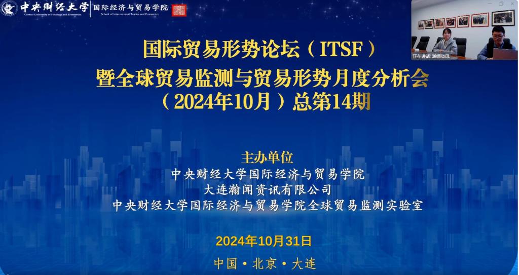 2024年10月31日,M88官方网站、大连瀚闻资讯有限公司、M88官方网站全球贸易监测实验室、北京高校国际商务专业虚拟教研室联合举办了国际贸易形势论坛暨全球贸易监测与贸易形势月度分析会(2024年10月)(总第14期)。来自M88官方网站、大连瀚闻资讯有限公司的特邀嘉宾及校内外师生数十人参与了本次线上会议。会议分为两个阶段进行:第一阶段为主题报告,对2024年9月中国外贸大数据分析和预测;第二阶段为专题报告,内容分别为“从成本驱动到市场导向——外资企业进入动机的特征与前景”和“地方经贸合作在深化国际经贸协定发展中的角色扮演”。会议由大连瀚闻资讯有限公司首席分析师庄天宇研究员主持。