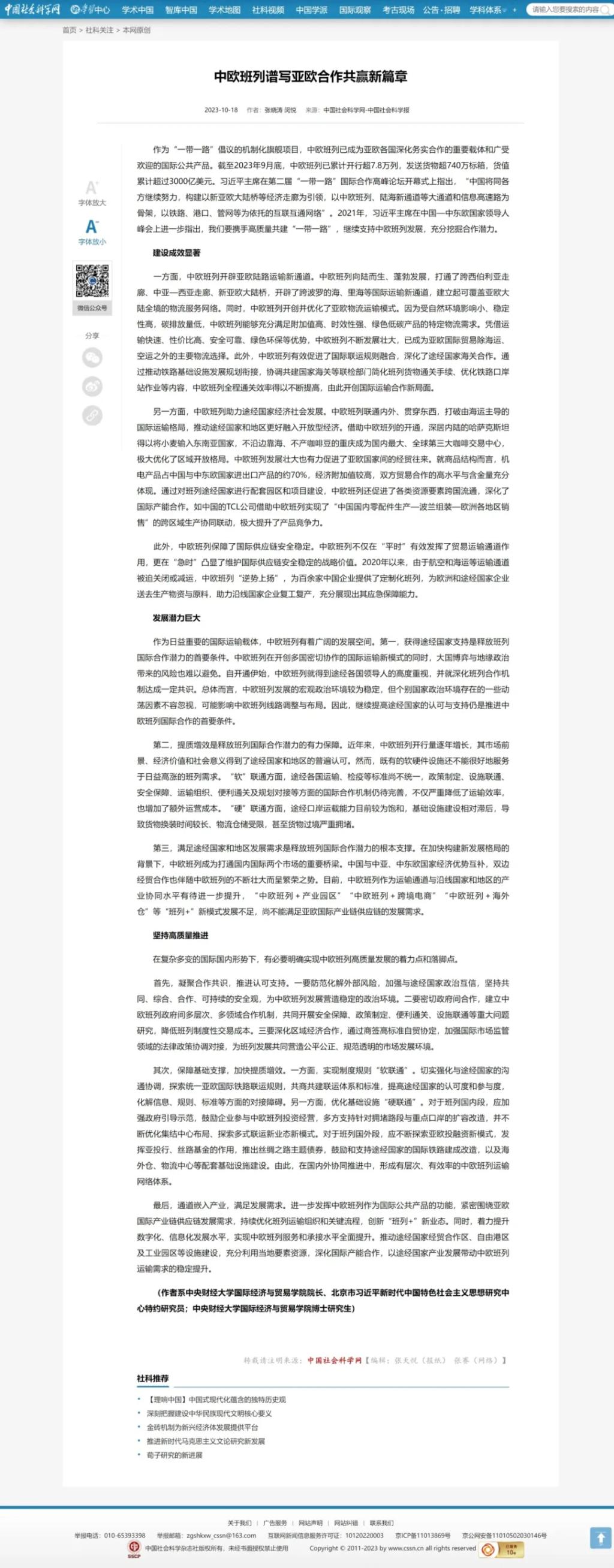 值此第三届“一带一路”国际合作高峰论坛召开之际,公司张晓涛教授和博士生闵悦在《中国社会科学报》发表文章《中欧班列谱写亚欧合作共赢新篇章》,相关内容刊登在《中国社会科学报》2023年10月18日第2753期。