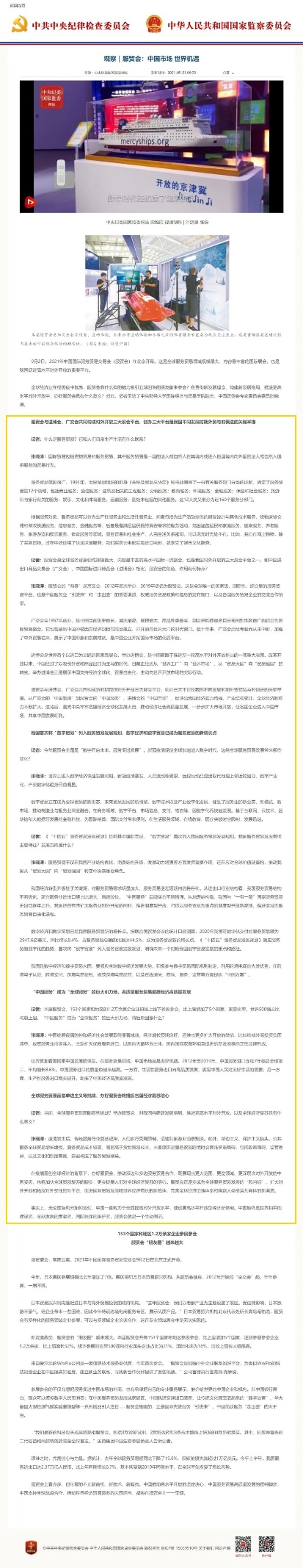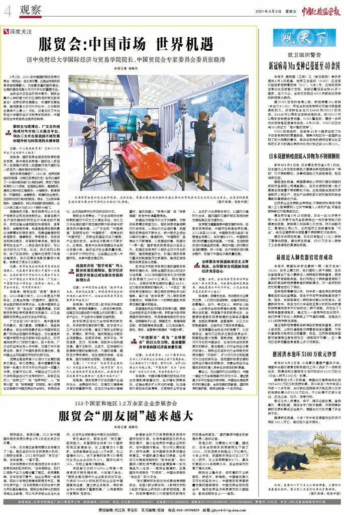近日,公司张晓涛教授以M88官方网站经理、中国贸促会专家委员会委员的身份接受了中央纪委国家监委网的采访,就服贸会及中国对外开放发表了观点,相关采访内容刊登在中央纪委国家监委网站和中国纪检监察报2021年9月3日第4版。