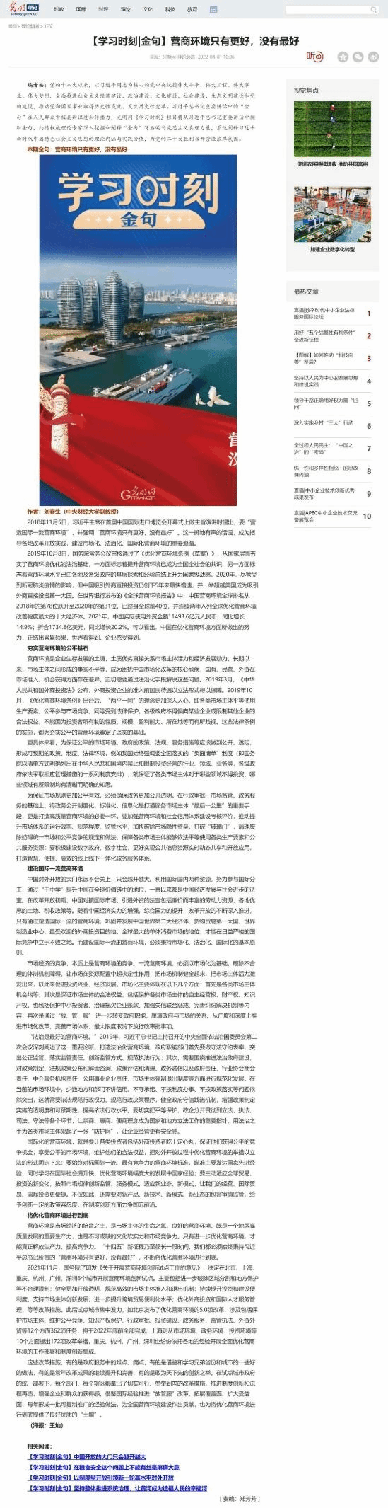 2022年4月1日,公司刘春生副教授应约在光明网发表文章《学习时刻金句:营商环境只有更好,没有最好》, 对习近平主席在首届中国国际进口博览会开幕式上做主旨演讲时的金句“营商环境只有更好,没有最好”进行了深入解读。
