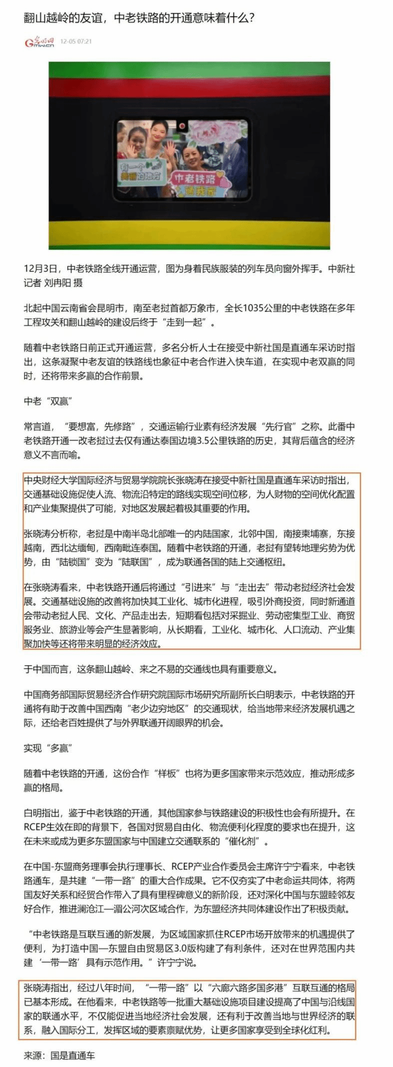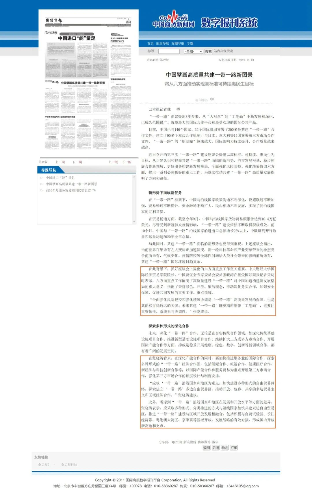 近期,公司张晓涛教授接受《国际商报》与中新社采访,就“一带一路”推动高标准可持续惠民生目标与中老铁路开通带来的新合作前景等话题表发表观点,相关采访内容刊登在国际商报2021年12月3日第二版、广交会微新闻2021年12月3日刊、中国新闻网2021年12月4日刊和光明网2021年12月5日刊。
