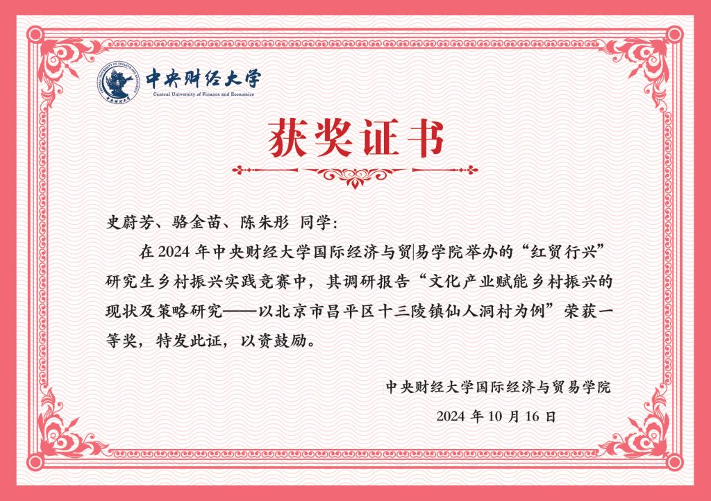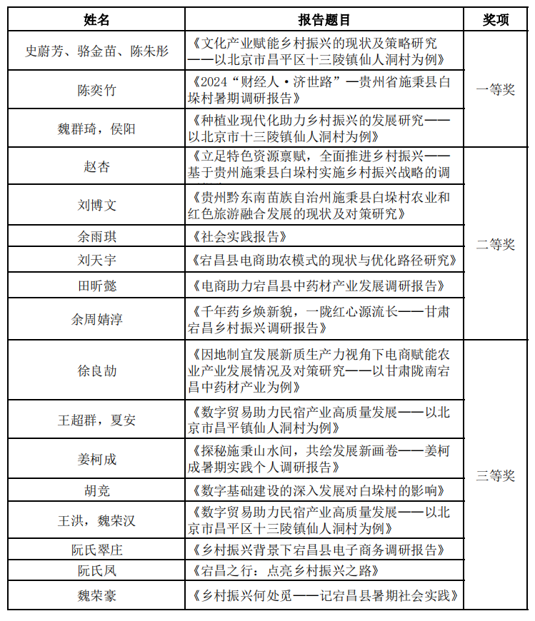 在实践调研结束后,三支调研队伍结合专业知识,根据当地发展的优劣势条件和面临的挑战,撰写了详实的调研实践报告。其中,共有17份报告入围公司第二届 “红贸行兴”研究生乡村振兴实践竞赛活动。竞赛评审委员会从调研内容的深度广度、调研方法的逻辑架构、调研成果的实践价值、调研报告的规范性和完整性等多个方面进行了多维度的审议评比。最终,本次竞赛作品共评选出一等奖3项、二等奖6项、三等奖8项,其中2023级硕士研究生史蔚芳、骆金苗、魏群琦,2024级硕士研究生陈奕竹,2022级本科生陈朱彤以及2023级本科生侯阳获得一等奖。