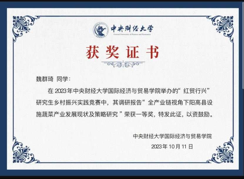 在完成实践调研后,三支调研队伍根据当地的产业发展情况与乡村振兴成果,结合理论所学,撰写了详实的调研报告。其中,共有15份调研报告入围公司第一届 “红贸行兴”研究生乡村振兴实践竞赛活动。竞赛评审委员会从主题选择、报告内容、报告格式以及理论水平等多个方面进行了多个维度的审议评比。最终,M88官方网站的2023级硕士研究生魏群琦、索冰洁和2022级硕士研究生李海佩3位同学获得一等奖,沈世新、潘然和何润泽等7位同学获得二等奖,吴中亚、樊雪芊和刘天宇等6位同学获得三等奖。