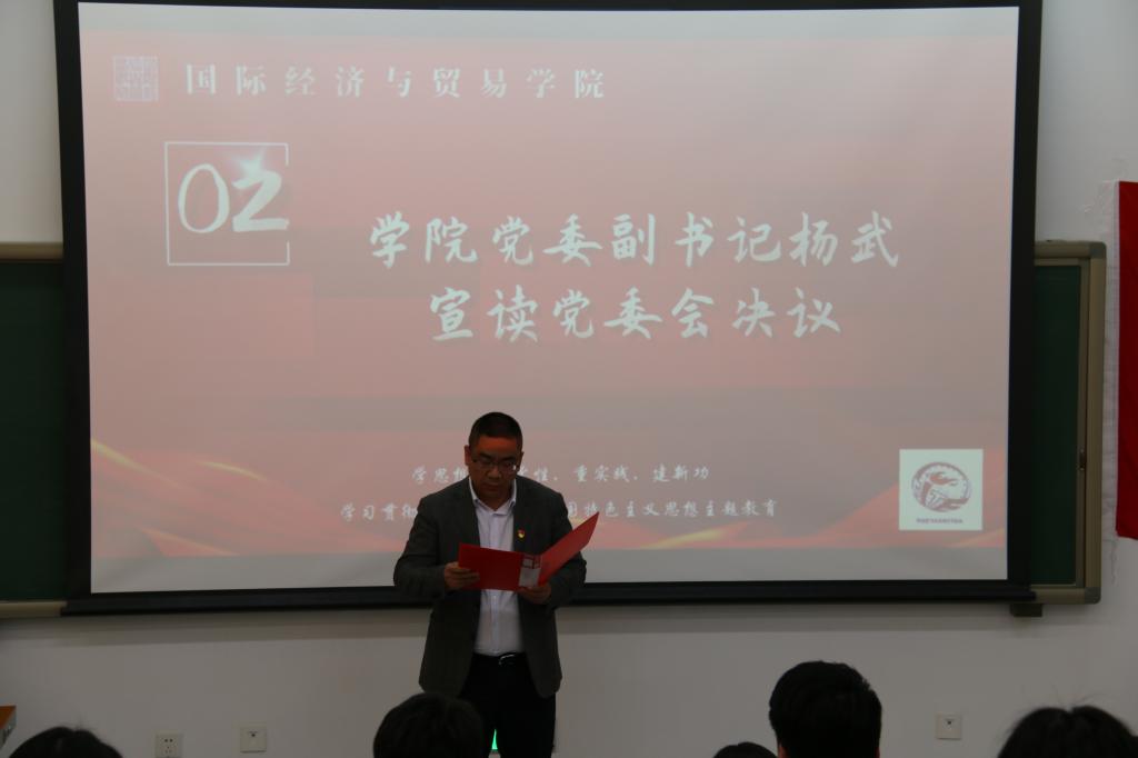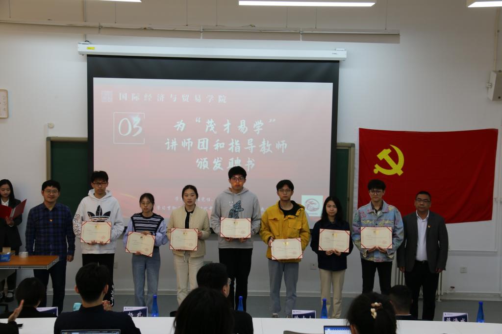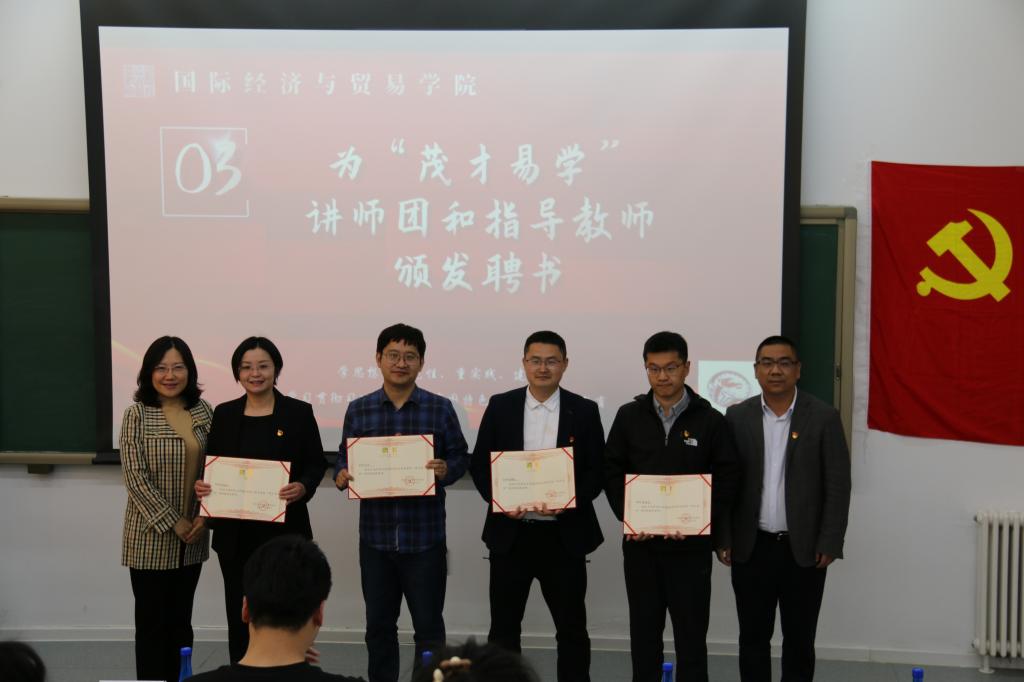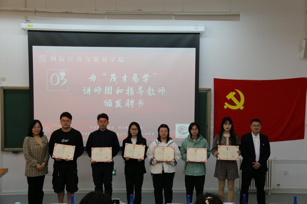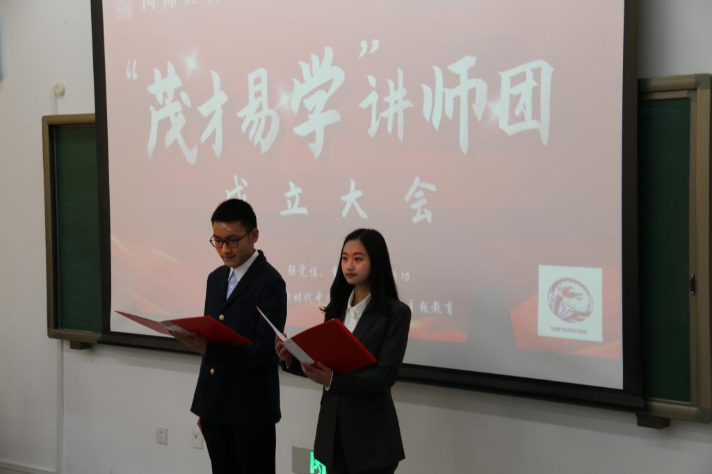 为学习贯彻习近平新时代中国特色社会主义思想主题教育, 弘扬“五四”爱国主义精神,传承中财红色财经文化,4月26日,国际经济与贸易公司党委在二教100教室召开了“茂才易学”讲师团成立大会,公司党委书记徐淼、公司党委副书记杨武、公司党委组织员徐士如、国际经济与贸易本科生党支部钟腾龙、国际贸易系教工党支部苗壮、国际商务系教工党支部俞脱脱、国际商务系教工党支部蒋海威、公司党委秘书、“红摇篮”党建工作基地负责老师邱小花、“红摇篮”党建工作基地全体干事和公司进步青年代表出席本次成立大会。大会由公司“红摇篮”员工党建工作基地党务工作部杨博新、王丹妮主持。