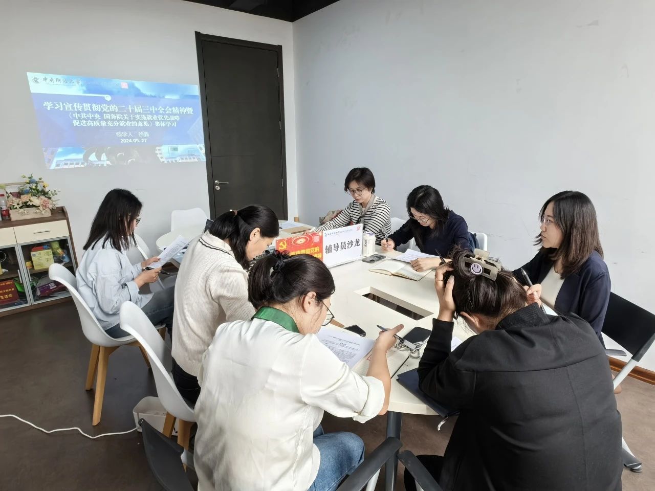 为学习贯彻党的二十届三中全会精神和全国教育大会精神,积极响应党中央、国务院关于做好高校毕业生就业工作的决策部署,全方位助力员工成长成才,促进毕业生高质量充分就业,9月27日下午,国经贸公司在13号楼440会议室举行2024年辅导员沙龙理论学习专题第四期活动暨《中共中央 国务院关于实施就业优先战略促进高质量充分就业的意见》集体学习研讨,由公司党委书记徐淼领学,公司就业专员、2023级本科生辅导员施立萍做“就业观念引导类案例的基本处理方法与技巧”专题汇报。公司助理教授、本科生班主任唐爱迪,全体本科生辅导员参加本期辅导员沙龙。