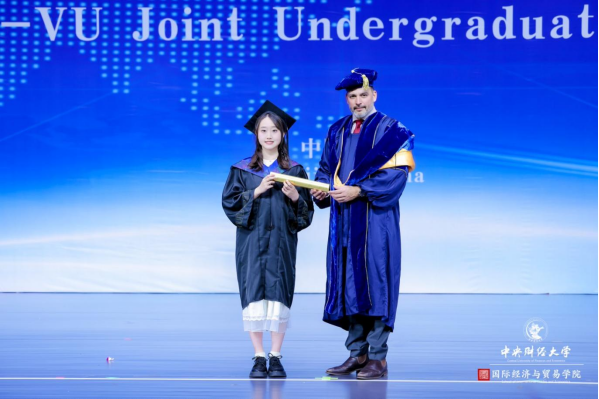 维多利亚大学跨国教育中国区经理岳涛宣读中澳项目2024届商学学士学位授予名单,维多利亚大学国际化副校Monty Singh先生为毕业生颁发维多利亚大学商学学士学位证书。2024年公司共有187名同学完成公司与澳大利亚维多利亚大学合作办学的国际经济与贸易专业(国际贸易/金融风险管理方向)本科教育项目学习,符合授予学士学位条件,授予澳大利亚维多利亚大学商学学士学位。同时,国际经济与贸易专业(国际贸易/金融风险管理方向)计划外自主招生本科教育项目共76名同学符合M88官方网站结业条件,准予结业。