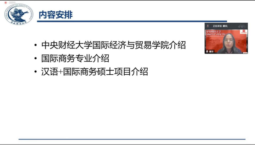 3月17日, “留学中财大”品牌推广系列活动-M88官方网站招生宣传说明会在腾讯会议线上举行。在宣讲会中,公司蒙双副教授为有意申请公司的国际员工介绍了公司基本情况、国际商务专业学习内容以及职工汉语+国际商务项目情况。